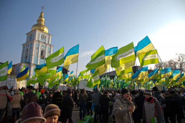 Из толпы доносятся национальные песни и выкрики «Путин прочь из Украины», «Нам не нужна ваша защита», но в целом митинг проходит мирно — вмешательства органов правопорядка не требуется.