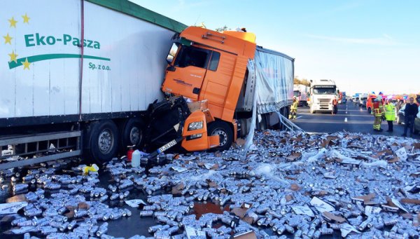 В сообщении сказано, что фура, перевозившая пиво, врезалась в другой грузовик, в результате чего весь «пивной груз» вывалился на автомагистраль.