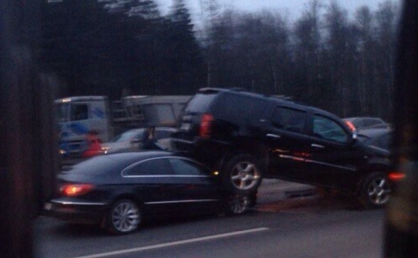 Столкновение на КАД сразу пяти автомобилей произошло сегодня утром, около 07:40. По словам очевидцев, причиной ДТП стало резкое торможение. Не успевший затормозить VW Passat врезался в двигающийся впереди внедорожник, после чего огромный черный Chevrolet Tahoe буквально «запрыгнул» на его капот. Далее по цепочке влетели остальные машины. Пострадавших нет.