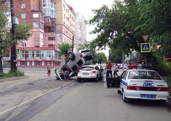 Авария произошла на пересечении улиц Карла Маркса и Советская. По словам очевидцев, на дороге никто из автомобилистов не хотел уступить друг другу до тех пор, пока не столкнулись. От удара внушительных размеров внедорожник подбросило и перевернуло, а далее он рухнул на Infiniti и ВАЗ-2110. Все три автомобиля получили сильные повреждения.